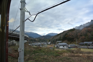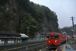 雨でレールが滑るのか、列車は止まりそうな程の低速です。