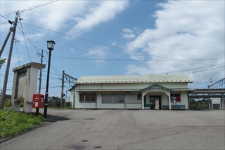 神社風の雰囲気はいいのですが、吹きっさらしの無人駅です。