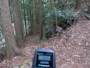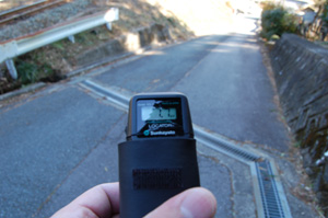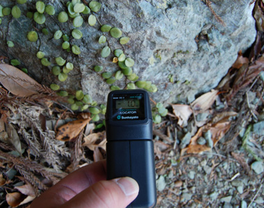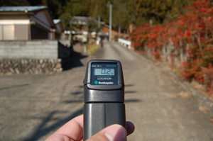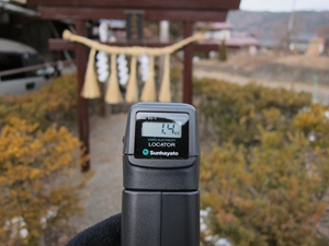 道がなくなったので斜面を降りると祠を発見。横を通りながら測定器を見ると数値が激しく変動しています。