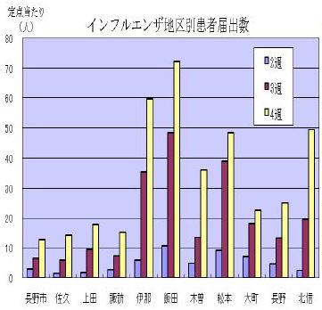 こちらは木曽保健所のインフルエンザ警報についての広報(2/1)の一部です。患者数は諏訪地域が最も少ないようです。