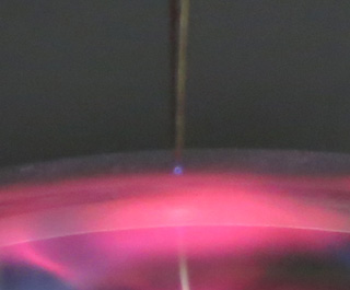 手を近づけるとプラズマが寄ってきて、ガラスと指の間に微小な放電が起きます。