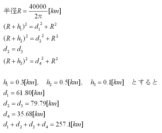 断層の上に現れたプラズマの突端では電波が回折して、遠くまで到達するはずです。地球を一周4万キロの球体とした時、その全経路長は次のようになります。