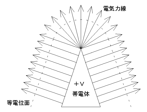 電気力線は仮想的なもので実在しませんが、電界の様子を説明するのに便利なものです。お互い交差せず、等電位面を垂直に貫き、等電位面では密度が一定です。ファラデーさん、便利なものをありがとう。