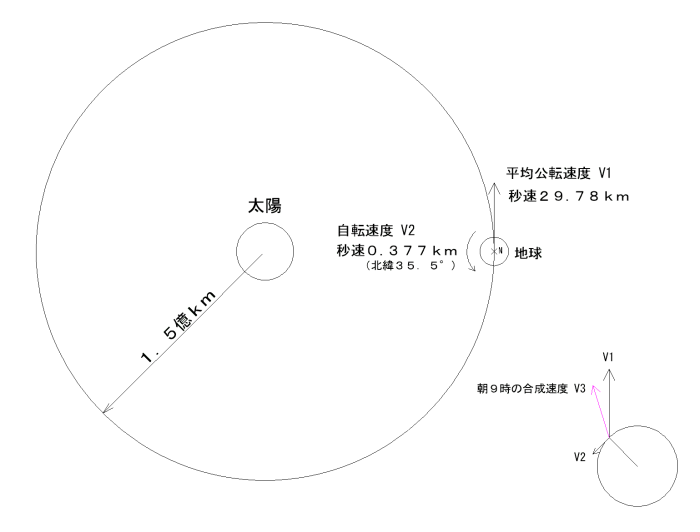 一方地球は自転もしており、日本付近の北緯35.5°では秒速約380mで回転しています。